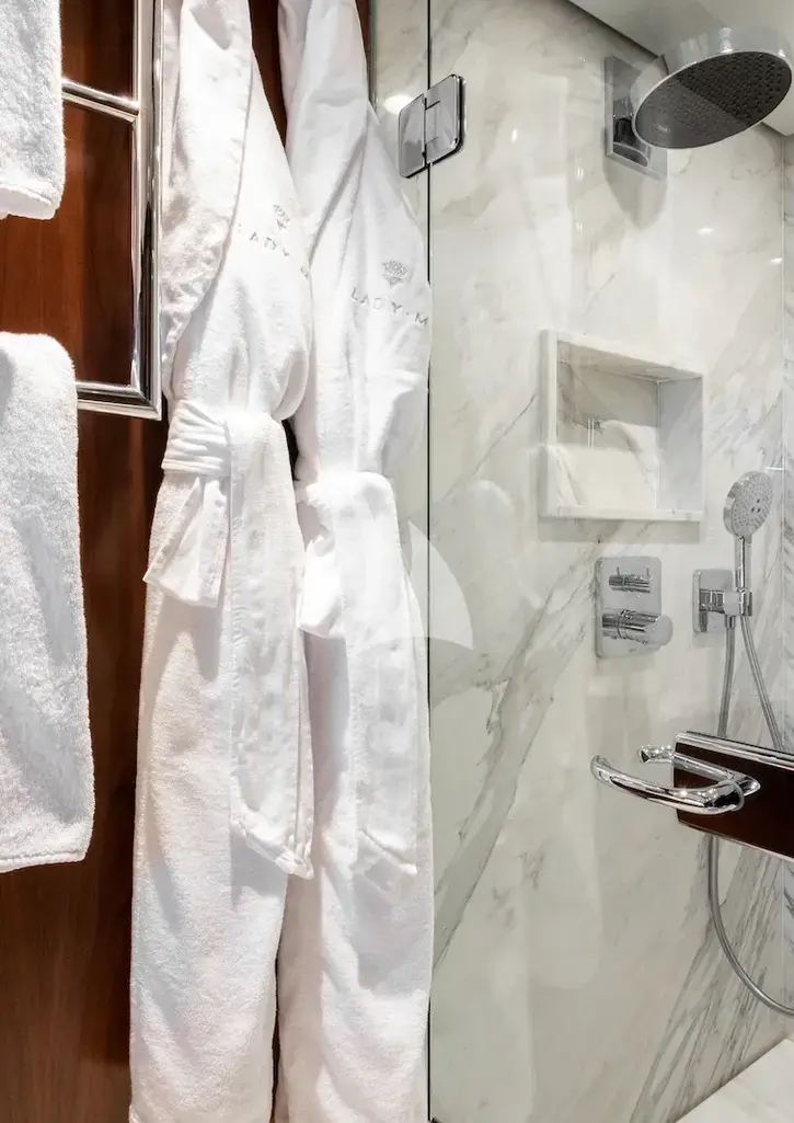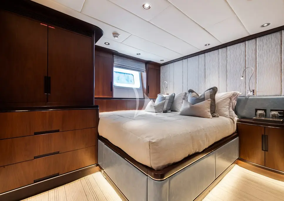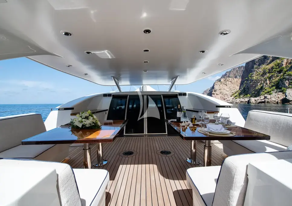 Her spacious layout includes comfortable accommodation for up to 10 guests in 4 elegant staterooms. Heading outdoors, there are many places to unwind, including a sunken relaxation space in the bow, suitable for sunbathing or reading a book in the optional shade, a sheltered al fresco dining area forward of the twin cockpit and additional relaxation space behind the cockpit, providing panoramic views and a seamless connection to the ocean. For the sun-filled days, LADY M's hydraulic drop-down swim platform provides easy access to the water and an array of water sports toys. LADY M’s attentive crew of 6 will ensure guests have a safe and enjoyable charter, creating many wonderful memories.